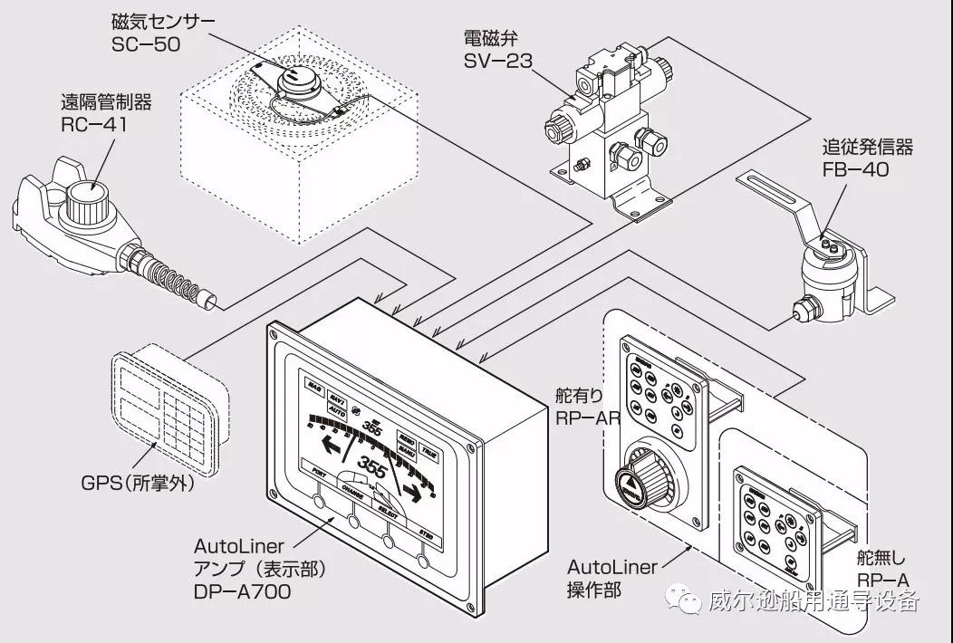 最近UNIKAS公司推出了一款新的自动舵:USDP-A700,下面为大家大概的介绍下这款自动舵。系统接线图:主要由显示单元DP-A700,操作单元RP-AR或者RP-A组成;舵角反馈器FB-40,遥控器RC-41,以及磁感应器SC-50是它的相关配件。